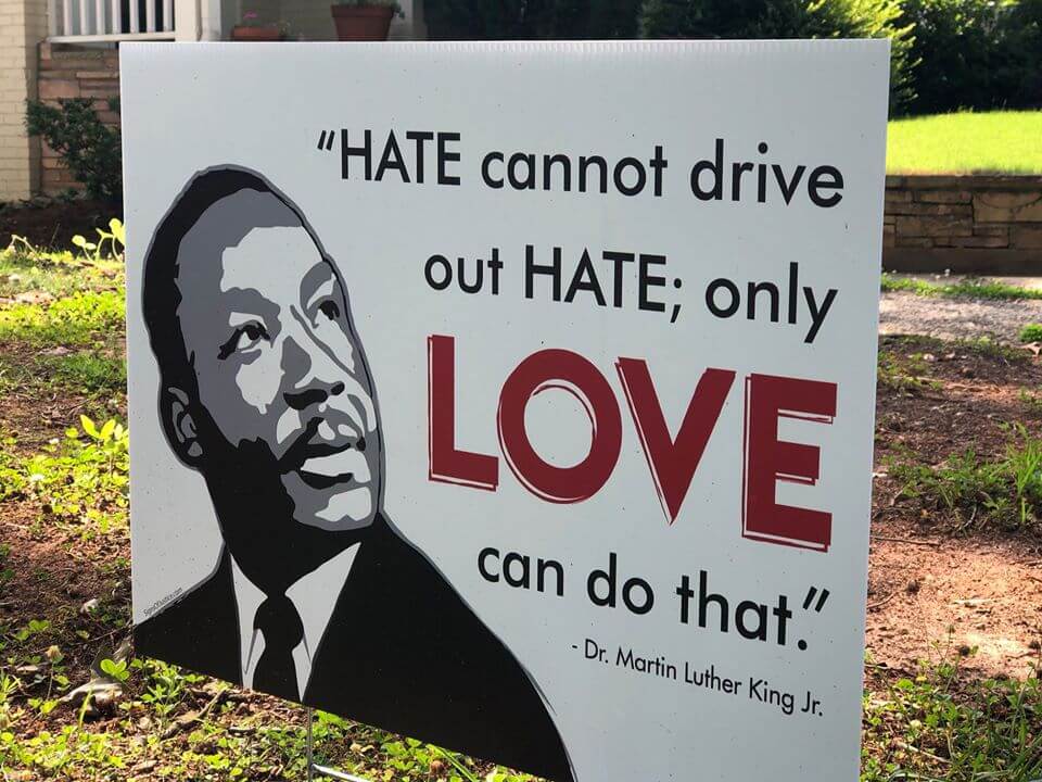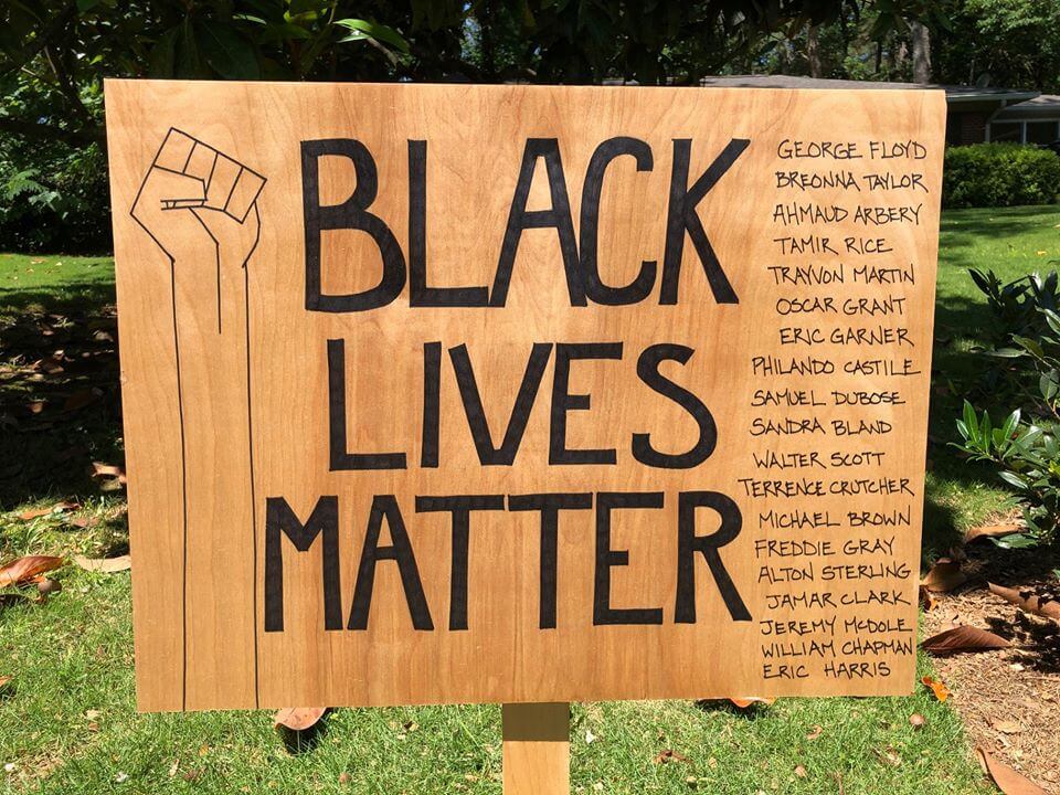 Homemade Black Lives Matter sign names the names. This is the most moving and impactful yard sign I have seen on my many long walks for fresh air during the COVID-19 pandemic.