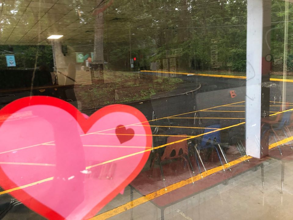 Window of a closed local school cafeteria. Valentine decorations still in place. We are living in a time of frozen plans.